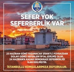 “23 Haziran günü yaşanacak şiddetli poyrazdan dolayı deniz seferleri iptal edilmiş olup, 24 Haziran’a kadar demokrasi seferberliği ilan edilmiştir. İstanbullu komşularımıza duyurulur.”